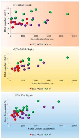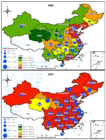 Carbon emissions and elderly dependency ratio by provincial administrative region in China in 2000 and 2019.