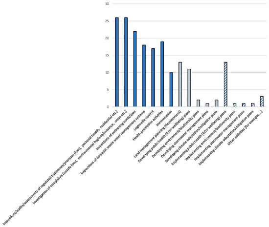 Main activities of EHOs identified by their executives (n = 28) (regulatory activities = solid fill, planning = cross-hatched, and implementation = hatched lines).