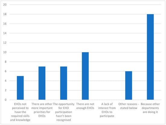 In response to the question “If EHOs are not involved in climate change/mitigation planning and the health impacts associated with climate change, why?”, the most common response was that the lack of involvement was “Because other departments are doing it” (Figure 2). Interestingly, no one chose the prompt “A lack of interest from EHOs.” The other reasons identified by executives using the free text box provided with this question included: