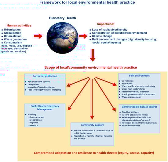 The framework acknowledges the impact of human activities on the health of the planet, and the consequential impacts and costs on natural and built environments. These impacts and costs then influence the scope and complexity of local environmental health practice, which can be categorized into five practice domains consisting of: