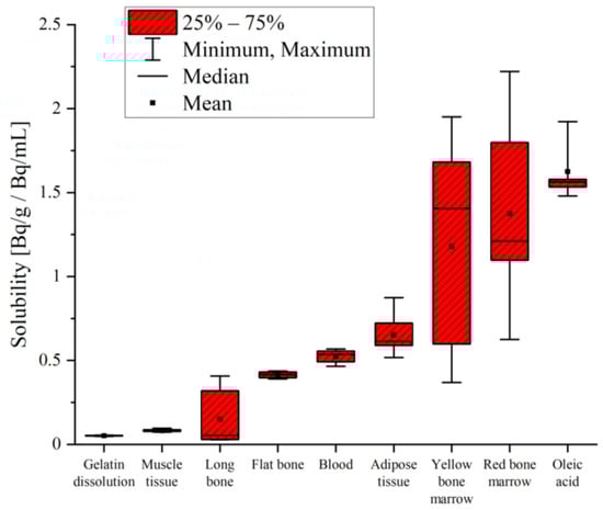 Bones show a completely different composition compared to any other tissue or sample measured within this study. Bones are characterized by a low proportion of fat (1%), a small amount of water (17%) and a high share of minerals—at 54% of their total mass [19]. During bone preparation, complete tissue removal was not technically possible—especially in long bones, where remaining bone marrow might have changed the solubility values. Tissue residues in general cause a wider range of values measured in bones. The observed discrepancies between flat and long bones could be due to their differences in composition. In total, ICRP displays the chemical composition for bones and does not differentiate between different types, as shown in Figure 5. However, they present additional data comparing two single-skeleton analyses. These data not only show differences in the composition of tibia and ulna (long bones) bones compared to ribs (flat bones) but, additionally, a variability of the same bone between different individuals of the same species becomes obvious [19].