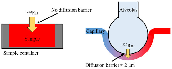 In Table 4, only the radon solubility in blood is the same order of magnitude, but is approximately 20% higher than reported in the literature—even though the exposure protocols differed significantly. In the in vitro experiments, blood was exposed in containers, while in the in vivo experiments, radon interacted with blood distributed in capillaries in the lung (Figure 4). With an air–blood barrier thickness of on average 2 μm in the human lung, the diffusion length is minimal, and saturation—depending on the partition coefficient between the air and blood—is supposed to be reached instantly [1]. During the blood sampling period in the animal studies, radon can diffuse out of the blood, explaining the higher values observed in our data.