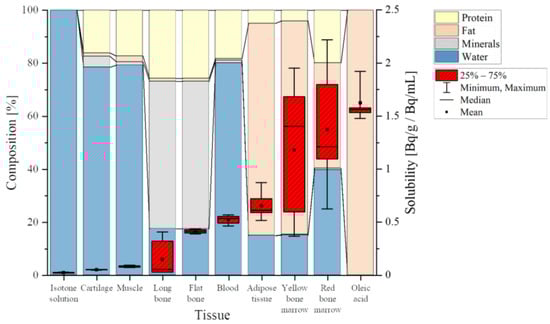The main important topic of our study was the influence of the molecular composition of tissues. In Figure 5, solubility data (red boxes) are compared, with the chemical composition of different samples grouped into protein (yellow), fat (orange), minerals (grey) and water (blue)—obtained from [19]—where bone composition was not further subdivided, similar to ICRP 23.