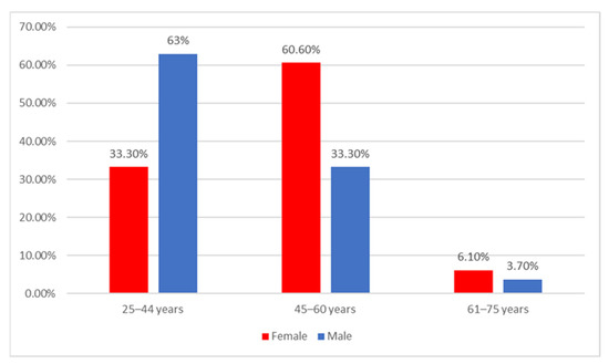 Data from Figure 1 show the distribution of the university teachers according to age and gender. Differences between groups are significant according to Fisher’s exact test (p = 0.031) and Z-tests with Bonferroni correction showed that university teachers with age between 25–44 years were more significantly men than women (63% vs. 33.3%) while university teachers with age between 45–60 years were more significantly women than men (60.6% vs. 33.3%).