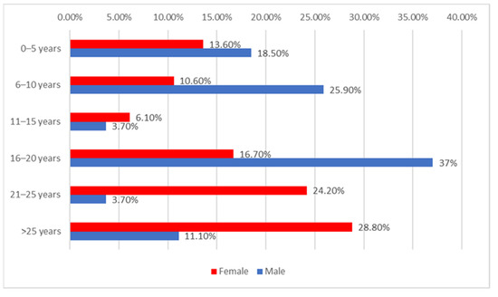 The distribution of the university teachers according to employment duration and gender can be extrapolated from Figure 2. Differences between groups are significant according to Fisher’s exact test (p = 0.011) and Z-tests with Bonferroni correction showed that university teachers with an employment duration between 16–20 years were more significantly men than women (37% vs. 16.7%) while university teachers with an employment duration between 21–25 years were more significantly women than men (24.2% vs. 3.7%).