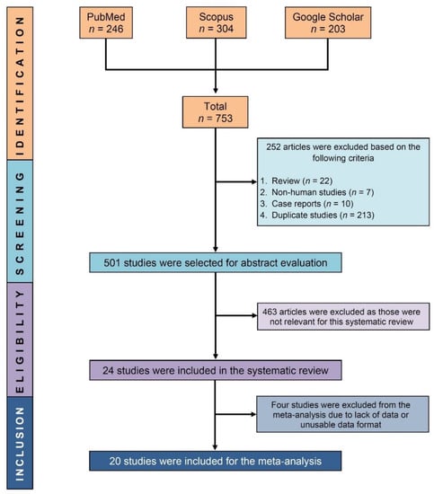 A total of 753 studies were identified using the search strategies. The abstracts and full texts of 501 studies were evaluated for eligibility after 252 papers were removed (213 duplicate studies, 22 review articles, 10 case reports, and 7 non-human studies). A total of 24 studies were found to be eligible for systematic review, and 20 of them were included in the meta-analysis (Figure 1).