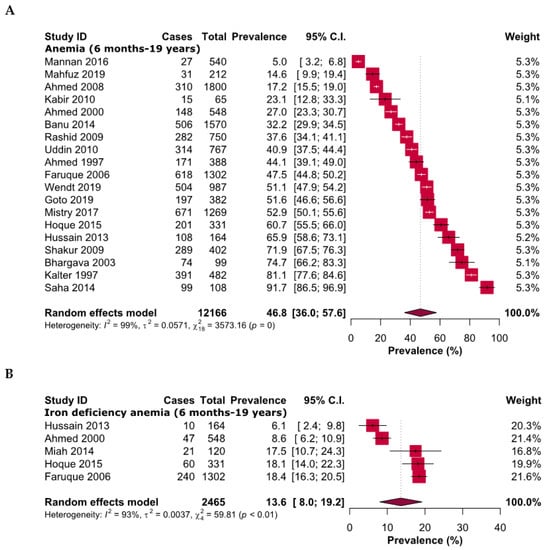 Prevalence of (A) anemia and (B) iron deficiency anemia in children and adolescents of Bangladesh.