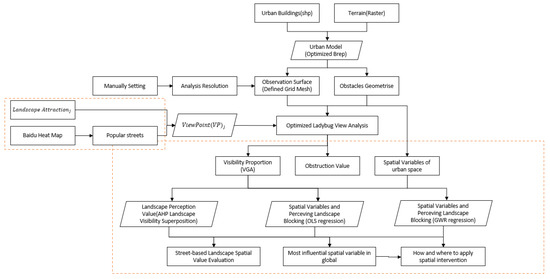 First, we broke down the problem of simple viewpoints with small-scale urban environments. (1) The current research analysis related to visibility was based on a single target or single viewpoint, which was relatively hard to adapt to multiview scenes and cross-scale scene analysis. (2) These analyses are often generalized small-scale analyses of a single viewpoint with simple analysis variables (e.g., openness and visibility), lacking purposeful analysis of specific landscapes and landmarks, or global applicability of a large urban environment [12]. (3) A handful of studies have the potential to link visibility analysis with more attributes. Hence, the analysis results were difficult in terms of providing practical assistance to urban planners and designers.