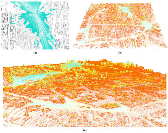 Generation 4 (3D voxel based)—Voxels hit by the line of sight can be counted as visible and invisible. The added value is that the building surface calculation can only calculate the current nearest block face once at a time but not the block face behind. The voxel calculation method can calculate all of the blocking spaces simultaneously (e.g., 3D Isovist advanced [35,36] and 3D voxel [25,37]).