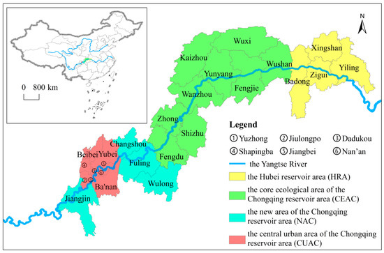 It divides the 26 counties (districts) of the TGRA into four major regions based on the current status of administrative divisions and a master plan for the construction of the Chengdu-Chongqing economic circle in Southwest China. They are the Hubei reservoir area (HRA) (Yiling District, Xingshan County, Zigui County, and Badong County), the core ecological area of the Chongqing reservoir area (CEAC) (Wushan County, Wuxi County, Fengjie County, Yunyang County, Kaizhou District, Wanzhou District, Zhong County, Fengdu County and Shizhu County), the new area of the Chongqing reservoir area (NAC) (Fuling District, Changshou District, Jiangjin District, and Wulong District), and the central urban area of the Chongqing reservoir area (CUAC) (Yuzhong District, Beibei District, Shapingba District, NanAn District, Jiulongpo District, Dadukou District, Jiangbei District, Yubei District, BaNan District). It should be noted that in 2016, Wulong County and Kai County in Chongqing were renamed Wulong District and Kaizhou District, respectively. Although the names were changed, the administrative area was not adjusted. To ensure the consistency of the study, the unified use of the adjusted administrative division name.