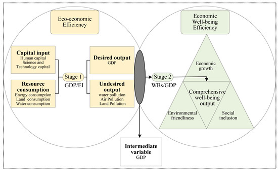 EWP is decomposed into two stages of realization to open the black box of the transformation process of ecological inputs and well-being outputs [42,44,52,53]. In the first stage, capital inputs are used as intermediate means to transform into undesired (environmental pollution) and desired (economic outputs) outputs through ecological inputs (resource consumption) [27,42]. That is, eco-economic efficiency; in the second stage, the intermediate variables (economic outputs) are used as inputs transformed into integrated well-being outputs, that is, economic well-being efficiency. The formula is as follows: