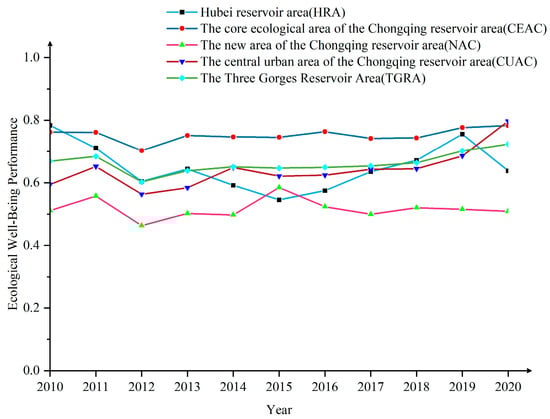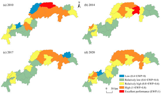 From 2010 to 2020, the EWP of the TGRA showed a “V”-shaped fluctuation trend (Figure 3), from 0.669 to 0.723, with an average annual growth rate of 0.79%, indicating that the efficiency of the TGRA’s ecological inputs to well-being outputs gradually improved during 2010–2020. Among them, the lowest value of EWP appeared in 2012, which may be caused by the convening of the 18th National Congress of the Communist Party of China, which established the strategy of ecological civilization and, to a certain extent, influenced the development model of high pollution and high energy consumption, causing a brief decline in local EWP. With the upgrading of industrial structures, the enhancement of environmental regulations, and the deepening of the concept of strong sustainability, the local EWP has gradually improved. Nevertheless, the current EWP of the TGRA is only 0.723, which is an ineffective state, and the conversion of ecological inputs into well-being outputs is less efficient and needs to be further improved in general.