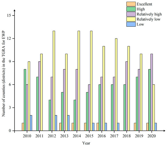 For the four major regions, CEAC > HRA > CCC > NAC, with mean values of 0.752, 0.651, 0.642, and 0.517, respectively. Among them, CEAC is significantly higher than other regions, consistent with its excellent ecological environment, low energy consumption, and low pollution. The long-term position of NAC at the bottom of the list, showing an inverted “V” structure, may be related to the fact that the NAC took over a large number of relocated industries in the early period, which led to a rapid increase in GDP and boosted the local EWP. Then, as energy consumption and pollution emissions intensified and economic growth slowed down, the local EWP experienced a significant decline. Unlike the three regions in Chongqing, the HRA shows a rapid decline and a rapid rise, probably due to the low level of economic development in the HRA, which was still in the early stage of industrialization before 2015. The rapid development of industry brought high energy consumption and pollution, which led to the decline in EWP. As industrialization entered the middle and late stages, industrial energy consumption and pollution decreased, per-capita GDP increased significantly, the ecological environment improved, and the EWP gradually rose. Finally, from the number of different levels of EWP (Figure 4), the 26 counties (districts) of the TGRA show an olive shape, i.e., there are few excellent and low-performance counties (districts). The number of relatively low, relatively high, and high counties (districts) accounts for approximately 94% of the total, which again indicates that the overall level of EWP in the TGRA is low and still needs further improvement.