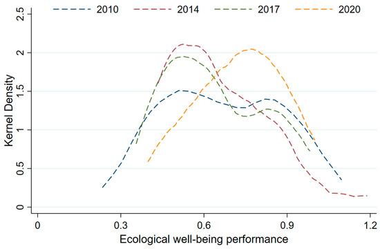 For comparison, the EWP of the TGRA in 2010, 2014, 2017, and 2020 was selected to plot the kernel density function in this study (Figure 5). The kernel curve moves to the right with the main peak and shows an overall upward trend, while the waveform shows a transition from a double peak to a single peak, indicating that the EWP of the TGRA is gradually improving and the polarization has weakened. In addition, the distribution curve indented from the right to the left side, and the double-tailed extension continued to become narrower, indicating that the internal variation in the TGRA was slowing down.