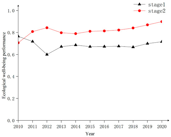 Both eco-economic and economic well-being efficiency show an increasing trend from 2010 to 2020 (Figure 7), indicating that ecological inputs and well-being outputs in the TGRA are gradually improving. However, both stages are less than 1 in 2010–2020, which is in the DEA invalid state, indicating that the relationship between economic development and environmental protection is not coordinated, and the level of economic development and well-being enhancement is not high. Among them, the efficiency value of the first stage is lower than that of the second stage for an extended period (the mean values are 0.686 and 0.818, respectively); the growth rate of the first stage is also lower than that of the second stage and the gap between them is gradually increasing. This result indicates that the overall economic output of the TGRA is insufficient, and the eco-economic efficiency is the main reason that restricts its EWP improvement, which is consistent with the conclusion reached by Wang et al. in the study of Poyang Lake [42]. The lack of eco-economic efficiency also indicates that ecological resource consumption and economic growth have failed to achieve decoupled development. The current economic growth is still at the cost of inefficient ecological inputs. The reasons for this outcome may be caused by the low transformation efficiency of ecological resources in the TGRA as a whole and the insufficient support role of human and scientific resources in the transformation process. At the same time, the slowdown of economic growth in middle and late industrialization may also play a limiting role.