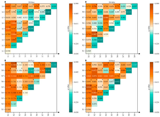 The explanatory variables were introduced into the Geodetector model to detect the influence of the spatial pattern of EWP in the TGRA in 2010, 2014, 2017, and 2020. The results showed (Table 7) that the level of economic development level > social-living conditions > policy system > natural environment, indicating that the level of economic development plays a dominant role in the pattern of EWP in the TGRA, and the social-living conditions and policy system play a significant role in the spatial pattern of EWP in the TGRA. The spatial pattern of EWP in the study area plays an important role, and the natural environment has a relatively weak influence.