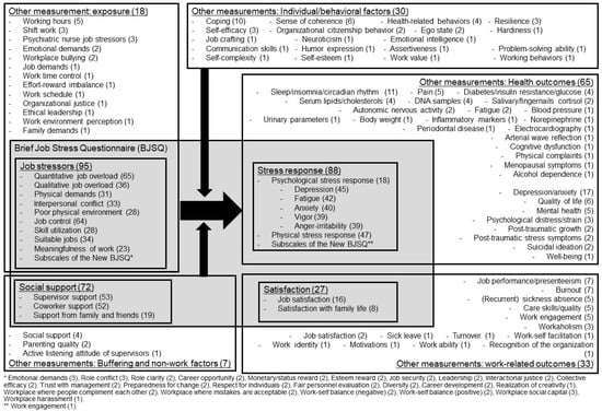Since this study aimed to summarize the usage of the BJSQ and the New BJSQ, no statistical data synthesis was conducted. Assessments of risk of bias within individual studies, heterogeneity, reporting bias, and certainty of evidence were not required to be conducted either. The collected data in the text and tabulation were qualitatively summarized. In addition, the number of subscales of the BJSQ and the New BJSQ and other measurements used were counted and visually placed, classifying them into five categories according to the job stress model []: (1) job stressors or exposures that relate to work conditions which lead to stress responses; (2) health-related outcomes including physiological and psychological responses; (3) work-related outcomes such as job satisfaction, job performance, and burnout; (4) individual and behavioral factors that modify the associations between job stressors and outcomes; and (5) buffering and non-work factors such as social support.