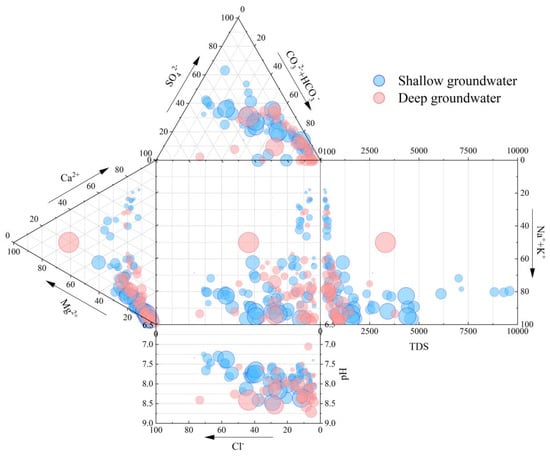 The groundwater pH ranges from 7.0 to 8.7 indicating weak alkaline conditions prevailing in groundwater in the study area. The EC and TDS range from 206 to 22,600 µs/cm and 208.9 to 10,661 mg/L, respectively, reflecting the different amounts of ionic substances in groundwater that may have an influence on salinity in groundwater. The maximum values of EC and TDS have been recorded in shallow groundwater (Table 1). However, EC shows a high variance in deep groundwater demonstrating the existence of overflow recharge from shallow groundwater. Furthermore, 33% (n = 42) of the samples exceed the permissible TDS concentration of 1000 mg/L [37,38]. The large variations of TDS may be found due to natural geochemical processes and anthropogenic interventions.