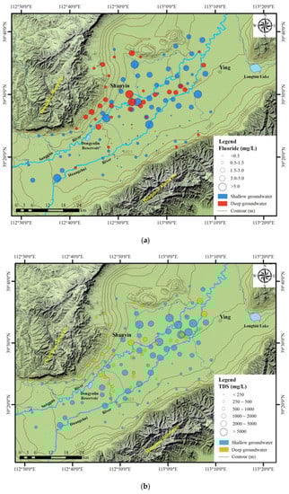 Horizontal distribution of groundwater (a) fluoride and (b) TDS concentrations in the study area.