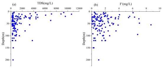 Both shallow and deep groundwater does not show any significant trends of TDS concentration. The high concentrations of TDS mainly occurred in very low depths, ranging from 5 to 40 m (Figure 4a). Only a few samples were recorded as high TDS concentrations in deep aquifers. The shallow groundwater was heavily affected by evaporation and evapotranspiration, which can be the main origin of high TDS groundwater in shallow depths.