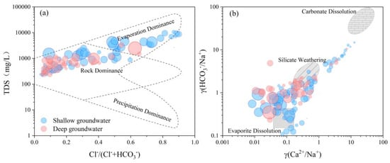 According to the Gibbs anion plot (Figure 5a), the major geochemical process is rock weathering, which dominates TDS concentration in the groundwater. Evapotranspiration is another leading geochemical process that increases TDS concentration, and has a greater influence on the hydrochemical compositions of shallow groundwater (Figure 5a). The relationship between γ(Ca2+/Na+) and γ(HCO3−/Na+) can be used to determine the source of major ions in groundwater [5]. The relationship between the ratios of γ(Ca2+/Na+) and γ(HCO3−/Na+) shows that the groundwater samples are mainly distributed near the end members of silicate salt rocks and close to the end members of evaporites (Figure 5b), indicating that the hydrochemical compositions of groundwater mainly originated from the weathering hydrolysis of silicate minerals and dissolution of evaporites, and relatively less affected by the weathering of carbonate rocks in Datong Basin. High fluorine groundwater is mainly affected by evaporation and karst decomposition.