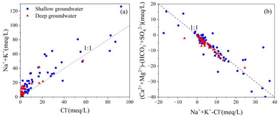(a) (Na+ + Ca2+) mg/L vs. Cl− mg/L; (b) (Ca2+ + Mg2+)-(SO42− − HCO3−)meq/L vs. (Na+ + K+ − Cl−) meq/L.