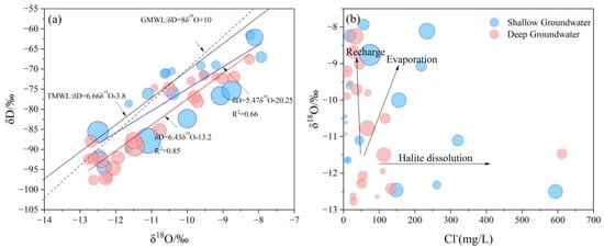 Isotopic fractionation is an important behavior of water that is used to assess various hydrogeochemical processes within a catchment basin [51]. According to the summary statistics from 42 analyzed samples, stable δ18O values range from −12.77 to −7.93 with an average value of −10.62 (SD = 1.48), and the stable δD values range from −97.60 to −61.50 with an average value of −80.15 (SD = 10.45). The results indicate that the groundwater is isotopically fractionated by evapotranspiration and water-rock reactions exist in both shallow and deep groundwater. Shallow groundwater has high δ18O values indicating the effect of excessive evapotranspiration in the study area. The prevailing semi-arid climate highly affects the shallow depths compared to the deep depths at Datong. However, high δ18O values have occurred in some of the deep groundwater aquifers may be attributed to a longer retention time. Figure 7a reflects the linear regression line equations for both shallow and deep groundwater samples showing good positive linear relationships between the two variables. The fitted lines have a lower slope than the meteoritic lines of the global meteoric water line (GMWL: δD = 8δ18O + 10) and Taiyuan Meteoric Water Line (TMWL: δD = 6.66δ18O − 3.8), indicating evapotranspiration plays an important effect on both shallow and deep groundwater in the study area.