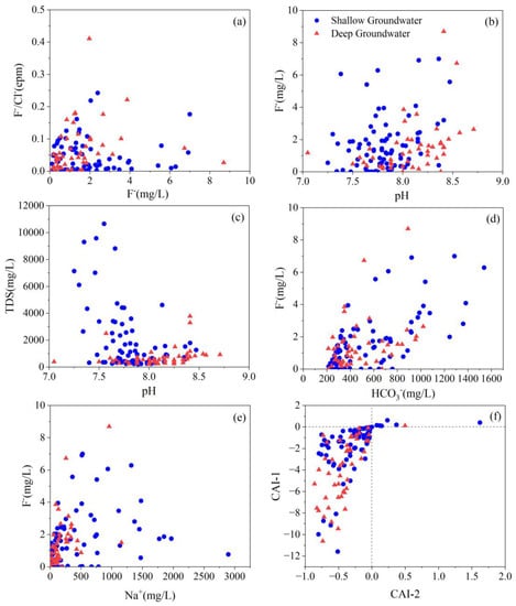 Scatter plots of (a). F− vs.F−/Cl− (epm); (b). pH vs. F−; (c). pH vs. TDS; (d). HCO3− vs. F−; (e). Na+ vs. F−; (f). CAI-2 vs. CAI-1−.