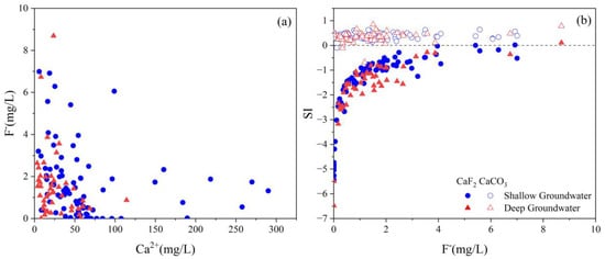 The majority of high F− concentrations occurred under low concentrations of Ca2+ (Figure 9a), indicating that Ca2+ could inhibit F−. Because Ca2+ has a strong affinity with HCO3− and CaCO3 precipitates, which reduces Ca2+ levels in groundwater and accelerates the dissolution of fluorite (Equation (5)), thus increasing the concentration of F− in groundwater.