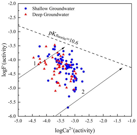When the activity of Ca2+ and F− in solution is greater than the fluorite dissolution equilibrium constant, the dissolution equilibrium of fluorite will move towards precipitation [45]. Samples are concentrated below the fluorite dissolution equilibrium line (pKfluorite = 10.6) (Figure 10), indicating that the F− concentration in groundwater samples is controlled by the fluorite solubility in the study area. When only fluorite was dissolved, the activity of F− and Ca2+ increased along trend line 1; however, most of the samples were located to the right of trend line 1, indicating that Ca2+ in the groundwater had other sources besides fluorite. Given that groundwater contains large amounts of HCO3− and SO42−, groundwater Ca2+ may come from dissolved calcite, dolomite, and gypsum. When calcite and fluorite were dissolved at a mass ratio of 200:1, the activity of F− and Ca2+ increased along trend line 2, and most water samples were located between trend line 1 and trend line 2, indicating that the concentration of F− was controlled by Ca2+ from dissolved sources of fluorite, calcite, gypsum and other minerals.