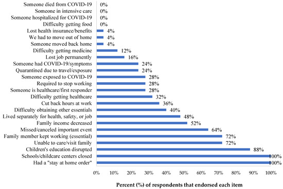 The most significant stress exposures due to COVID-19 were associated with the lockdown mitigation orders (i.e., school closures). A high proportion of participants reported a family member working outside the home. This phenomenon was observed in Hispanic/Latino populations in the United States mainland, who are the workers most likely to hold frontline occupations and have limited opportunities for remote work compared with other populations [39].