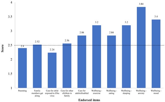 COVID-19 Exposure and Family Impact Survey (CEFIS)—Impact Scale endorsed items (mean values) by study participants. Note: Higher scores indicate a higher impact with worse outcomes. The midpoint of the scale (identified with a dotted line) is 2.5; the items’ score range is 1 to 4 points.