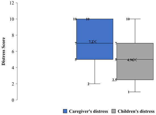 COVID-19 Exposure and Family Impact Survey (CEFIS)—Distress Scale experienced by caregivers and their children due to COVID-19. Note: Higher scores indicate higher perceived distress; the items score range is 1 to 10 points.