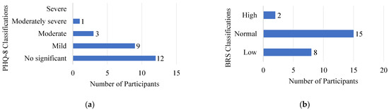 Caregivers’ scores classification on (a) the Patient Health Questionnaire (PHQ-8) and (b) the Brief Resilience Scale (BRS).