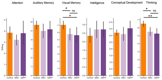 Performance in cognitive tasks assessed for AMC patients (light purple), OBPP patients (dark purple), and control children (orange). Asterisks between the bars indicate the significant difference shown by post hoc Mann–Whitney comparisons between two groups (* p < 0.05; ** p < 0.01, ns: not significant).