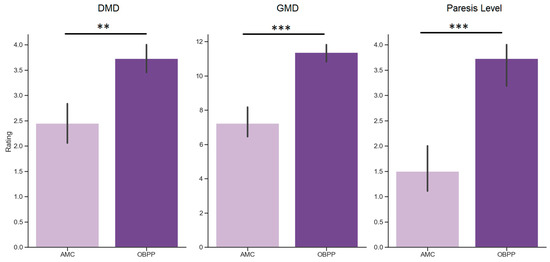 We also assessed the difference in motor skills between children with AMC and OBPP diagnoses (Figure 2). The series of Mann–Whitney tests revealed that OBPP children showed significantly higher motor performance than AMC children. Specifically, they demonstrated higher DMD scores (u = 24.4, p = 0.001), higher GMD scores (u = 10.5, p < 0.001), and higher level of paresis (u = 21.0, p < 0.001).