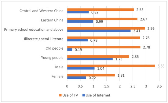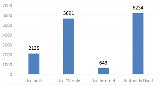 The use of the TV and the Internet was further analyzed, as shown in Figure 1. In total, 2135 samples used the TV and the Internet to obtain news at the same time, accounting for 14.52% of the sample size. The number of residents using only the TV and the Internet was 5691 and 643, respectively; 6234 neither used the TV nor the Internet and accounted for 42.40% of the total samples.