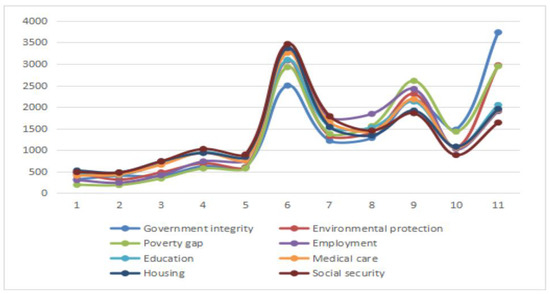 Furthermore, as illustrated in the chart in Figure 2, China’s overall social and environmental problems were already rather serious, and the government needs to take effective measures to avoid mass incidents that endanger social stability and national security. Schultz, one of the key figures in institutional economics and a famous American economist, said, “Any system is a response to existing needs in real life” [58]. As China has entered the deep waters of reform, some existing political, economic, and other related systems cannot fully meet the needs of the contemporary era, and institutional innovation and improvement are needed to improve rural residents’ satisfaction with the social environment.