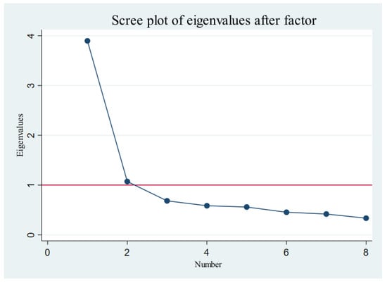The principal component and factor analyses were carried out on the eight explained variables. Figure 3 is the scree pot diagram of the principal component analysis and factor analysis. As can be seen, the first and second characteristic roots were greater than 1, and the remaining characteristic roots were less than 1. Moreover, the KMO statistic of the sample was 0.8715. These demonstrated that the factor analysis method was more suitable.