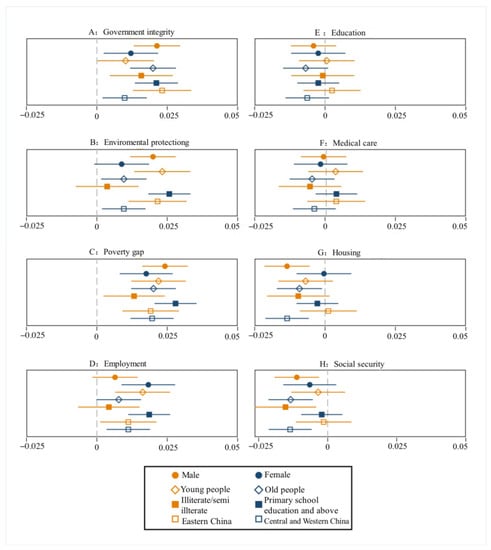 As can be seen from Figure 6, in the sample regression results of different characteristic groups, the use of the TV to obtain news information has a significant impact on the social environment satisfaction of rural residents of different genders, ages, educational backgrounds, and regions. Consistent with the benchmark return, the number of days rural residents with different characteristics use the TV to acquire news each week has increased, and their satisfaction with the social environment in terms of government integrity, environmental protection, the gap between the rich and the poor, employment, and other aspects is more negative, but they are more positive in terms of education, medical care, housing, and social security. Specifically, when female rural residents increase the use of the TV to obtain news information one day a week it results in more negative social environment satisfaction in terms of government integrity, the gap between the rich and the poor, and employment. However, male rural residents who use the TV to obtain news information one day a week are more negatively satisfied with the social environment in terms of government integrity, environmental protection, and the gap between rich and poor, and more positively satisfied with the social environment in terms of housing and social security. The use of the TV is also a significant influencing factor for young people in terms of government integrity, environmental protection, the gap between rich and poor, and employment, while the use of the TV is a significant influencing factor for middle-aged and elderly people in terms of government integrity, environmental protection, the gap between rich and poor, education, housing, and social security. Rural residents with a primary school education and above use the Internet to obtain news information every day, and their satisfaction with the social environment in terms of government integrity, environmental protection, the gap between the rich and the poor, employment, etc. is more negative. Rural residents with illiterate/semi-illiterate educational backgrounds who use the TV to obtain news information every day are more negative in terms of social environment satisfaction regarding government integrity and the gap between rich and poor, and more positive regarding housing and social security. No matter which region, the use of the TV will affect the social environment satisfaction of rural residents in terms of government integrity, environmental protection, wealth gap, employment, education, housing, and social security.
