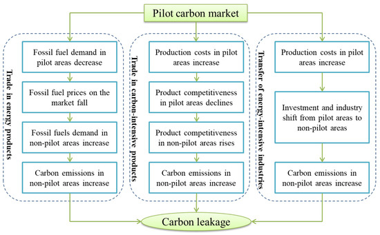 Many scholars have suggested that there are three main channels of strong carbon leakage between emissions reduction and non-emission-reduction countries: trade in energy products, trade in carbon-intensive products, and the transfer of energy-intensive industries [7,10,11,12,13]. The trade channel of energy products refers to the reduction in fossil fuel demand in abating areas due to emissions reduction targets, resulting in a reduction in fossil fuel prices in the energy market. This will increase the purchase and use of fossil fuels in non-abating areas, resulting in an increase in carbon emissions in non-abating areas. The trade channel of carbon-intensive products refers to the fact that the production cost of carbon-intensive products in abating areas may rise due to emission reduction constraints, so as to weaken the competitiveness of products in abating areas in the market and indirectly enhance the market competitiveness of products in areas without emission reduction constraints. This will promote more market demand to non-abating areas, resulting in an increase in carbon emissions in non-abating areas. The last carbon leakage channel refers to that due to the rise of production costs, enterprises in abating areas are more inclined to transfer industries or investment to areas without emission reduction constraints or relatively loose emission reduction policies in order to obtain greater profits, resulting in the increase in carbon emissions in non-abating areas.
