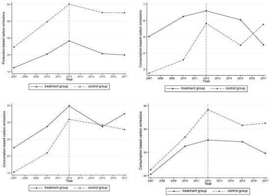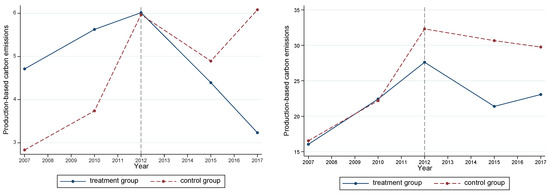 The premise of using the DID method is that the treatment and control groups should first comply with the parallel-trend hypothesis. This indicates that the trends in the two groups before the implementation of the policy should be consistent. There are two methods to test this hypothesis: (1) draw the trend chart of carbon emissions over time in the pilot and non-pilot areas (as shown in Figure 2), and (2) test by regression. The regression model was derived as follows: