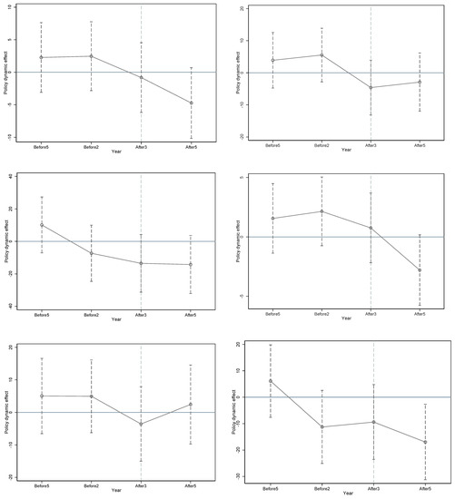 where Treat × Dyear represents the interaction item between the dummy year and dummy treatment group. If the year was before 2012, the interaction coefficient, , between the dummy variable and dummy variable of the treatment group was not significant, indicating that there was no significant difference between the pilot and non-pilot areas before the implementation of the policy. This showed that the parallel-trend hypothesis was met.