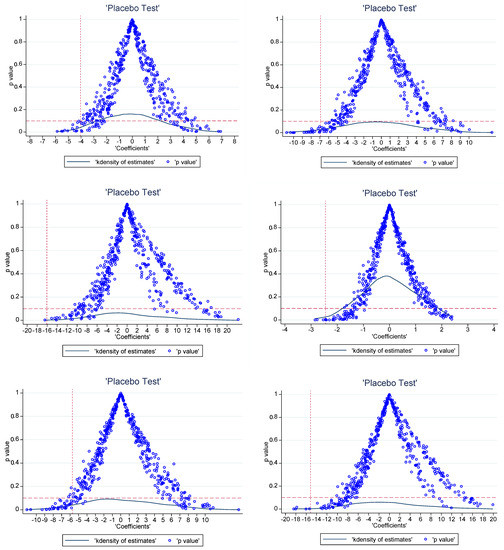 Based on Figure 4, the p-value of most of the estimated values was greater than 0.1 (not significant at the 10% level). The real estimated value of the DID model was significantly different from most of the estimated values, which indicated that the estimated results in this study were unlikely to be obtained by chance, so the DID results of the chemical, building materials, and metal industries were unlikely to be affected by other policies or random factors.