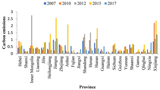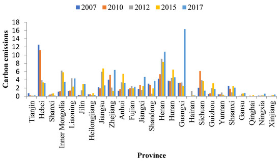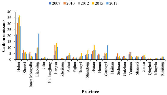 For the metal industry (Figure 7), carbon transfer from the pilot areas in Inner Mongolia, Jilin, Shandong, and Qinghai increased by 1.32, 1.05, 5.67, and 0.76 MtCO2, respectively, from 2012–2015, but decreased by 0.33, 0.42, 3.16, and 0.68 MtCO2 from 2015–2017. Overall, an upward trend was observed from 2012–2017. Fujian’s carbon transfer from the pilot areas increased from 2012–2015 and 2015–2017, with an increase of 0.08 and 0.81 MtCO2, respectively. Before the pilot carbon market was launched, carbon transfer from the pilot areas in Inner Mongolia, Jilin, Fujian, Shandong, and Qinghai showed a downward trend. Additionally, carbon transfer from the pilot areas in Liaoning and Guangxi increased by 4.21 and 1.81 MtCO2, respectively, from 2007–2012; carbon transfer from 2012–2017 increased more rapidly. Carbon transfer from the pilot areas in Liaoning and Guangxi increased by 0.72 and 0.74 MtCO2 from 2012–2015, and 11.61 and 6.40 MtCO2 from 2015–2017, respectively, with a larger increase from 2015–2017. Therefore, after the pilot carbon market was launched, the pilot areas were most likely to leak carbon emissions from the metal industry to Inner Mongolia, Jilin, Fujian, Shandong, Qinghai, Liaoning, and Guangxi. Inner Mongolia, Jilin, Shandong, and Qinghai were caused carbon leakage from 2012–2015, while Liaoning, Fujian, and Guangxi were caused carbon leakage from 2012–2015 and 2015–2017, but mainly from 2015–2017. Particularly, Liaoning (9.36%) was the main carbon emissions source in the pilot area undertaking metal products. These regions should focus on the increase in carbon transfer from pilot areas.