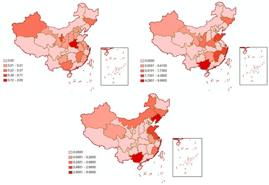Table 6 lists the carbon emissions transferred from the pilot areas by the three major industries in each non-pilot area and the proportion of carbon emissions transferred from each province. Xinjiang, Jiangsu, Inner Mongolia, Hunan, Shandong, Henan, Hebei, Anhui, Heilongjiang, Shaanxi, Jilin and Zhejiang were the main carbon emission undertaking places of chemical products in the pilot area; the proportion of carbon emissions transfer in reached 75.95%. Henan, Hebei, Guangxi, Hunan, Jiangsu, Zhejiang, Inner Mongolia, Sichuan, Anhui, Jilin, Jiangxi and Shandong were the main carbon emissions undertaking places of building materials products in the pilot areas; the transfer in of carbon emissions accounted for more than 82.93%. Hebei, Liaoning, Jiangsu, Henan, Guangxi, Shanxi, Shandong, Yunnan, Inner Mongolia and Anhui were the main carbon emissions undertaking places of metal products in the pilot area; the transfer in of carbon emissions accounted for 78.75%.