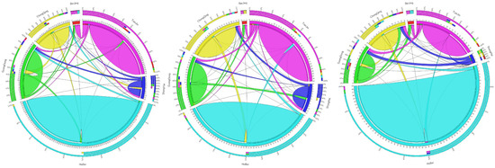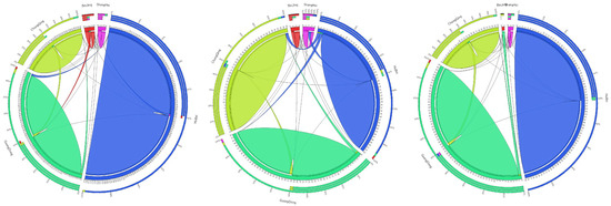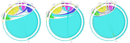 Carbon emissions flows among the pilot areas. The top three chords represent the carbon emissions flow chart between the pilot areas of the chemical industry in 2012, 2015, and 2017. The three chords in the middle represent the carbon emissions flow chart between the pilot areas of the building materials industry in 2012, 2015, and 2017. The bottom three chords show the carbon emissions flow chart between the pilot areas of the metal industry in 2012, 2015, and 2017.