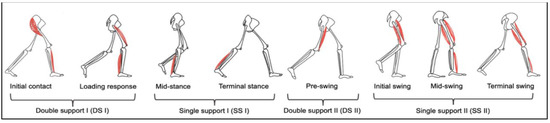 A gait cycle was divided into eight sub-phases and started at the instant when one foot touched the floor and stopped when the same foot came into contact for the next step, based on the literature [12]. Each sub-phase consisted of (1) initial contact, (2) loading response, (3) mid-stance, (4) terminal stance, (5) pre-swing, (6) initial swing, (7) mid-swing, and (8) terminal swing (Figure 1). These were identified using visuals associated with the synchronized EMG video recording.