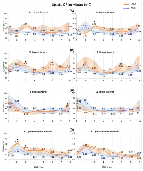 Figure 3 shows a comparison of the EMG activity during walking in two conditions. The activity of all muscles was significantly higher level when individuals with CP walked on land compared to walking in water. Those are significant median differences in the RF (Lt.: 2.37, p = 0.002) during the mid-stance (Figure 3A) and the BF during the mid-stance (Rt.: 2.00, p = 0.04), the loading response (Lt.: 1.11, p = 0.01) and both sides during the initial swing (Rt.: 1.73, p = 0.01; Lt.: 1.63, p = 0.008) (Figure 3B). The TA during terminal swing (Rt.: 0.50, p = 0.02), the GM during loading response (Rt.: 2.31, p = 0.01), and the mid stance (Rt.: 1.10 p = 0.04), which are presented in Figure 3C,D.