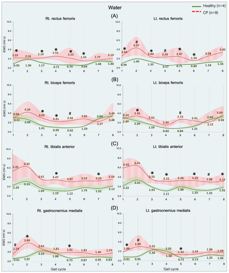 This study presents the first article to investigate the EMG activity and co-activation between concurrent agonist and antagonist in both lower extremities to analyze each gait sub-phase and those compared the healthy and CP individuals during walking on land and in water. This study found non-significant differences in the EMG activity of RF, BF, GM, and TA muscles in each gait sub-phase in the healthy group in comparing walking between land and in water. Within the CP group, there was significantly decreased EMG activity of the four muscles in a few sub-phases of the water gait when compared to land, there was significantly greater EMG activities of all muscles in various gait sub-phases compared with the healthy individuals in both conditions.